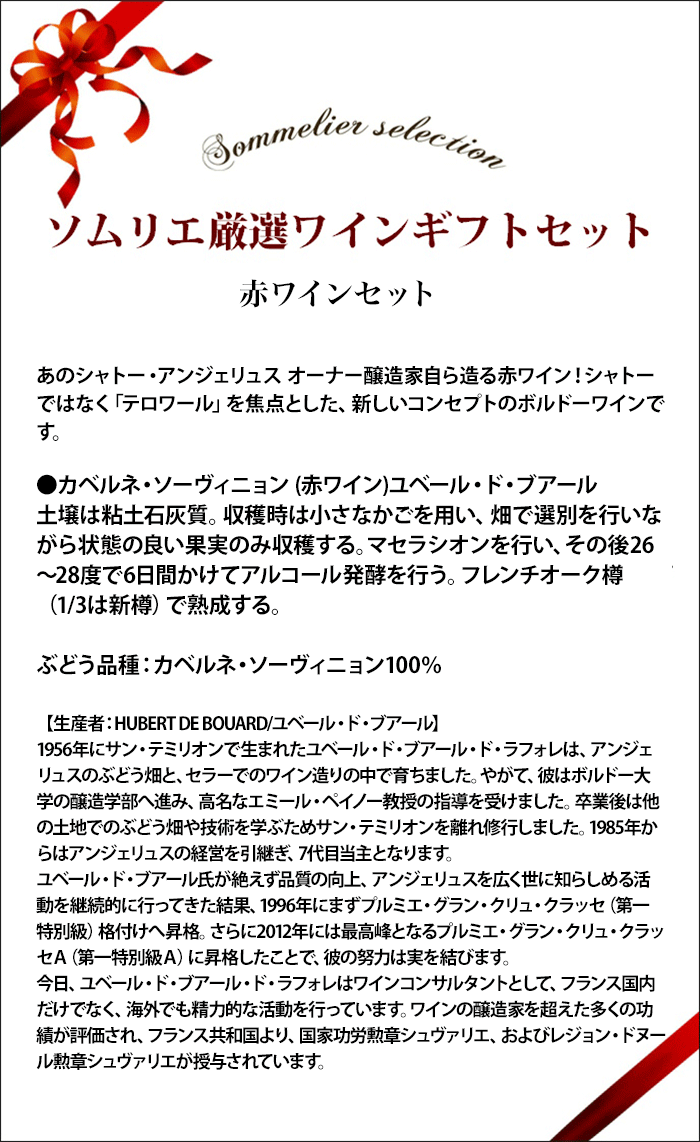 赤ワイン好きの方へ贈りたいけど何がいいかわからないという方にはこちら。あのシャトー・アンジェリュス オーナー醸造家自ら造る赤ワインです!これなら外さない、恥ずかしくない赤ワインです。