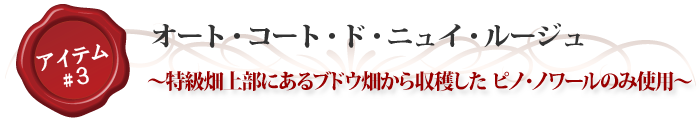 名高いコート・ド・ニュイの特級畑上部にあるブドウ畑から収穫した ピノ・ノワールのみ使用。まず15日間醸しを行い、半分はステンレスタンクに移し、残り半分はオーク樽へ移します。ステンレスタンク発酵では、ピノノワールの華やかな果実味を引き出し、樽熟成ではタンニンを引き出し、ワインの骨格を造ることを目的としています。この二つを最後にアッサンブラージュして整え、バランスの取れた味わいを表現します。