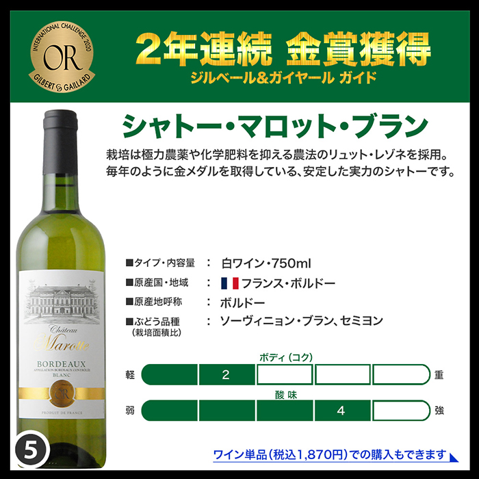 ●シャトー・レ・セット・シェーヌ/ヴィニョーブル・ランディエ ●シャトー・ル・ロック/ヴィニョーブル・ランディエ ●フルール・グラン・シャン・デュ・シャトー・オー・リュフラジェ/ファミーユ・プティ ●シャトー・ル・フォール/ヴィニョーブル・モーブラック・ゲラン |