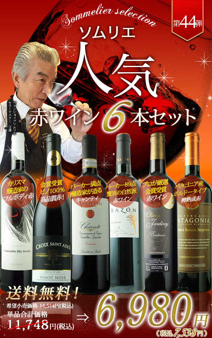 ソムリエ人気赤ワイン6本セット 第58弾 送料無料 赤ワインセット「9/19更新」
