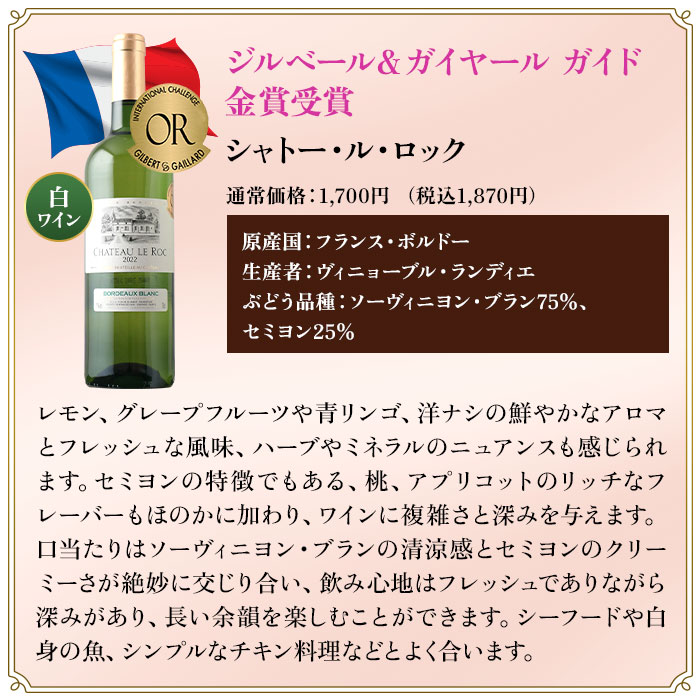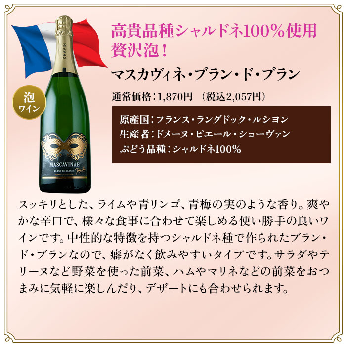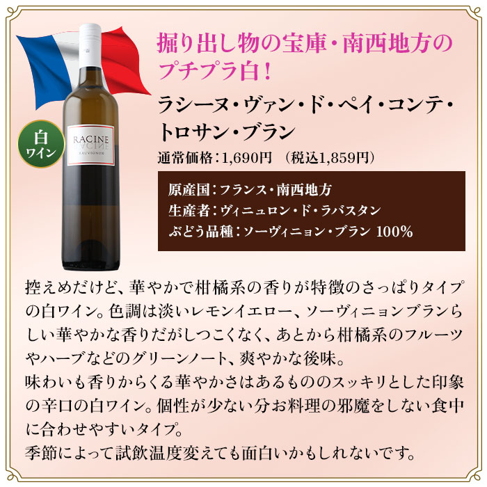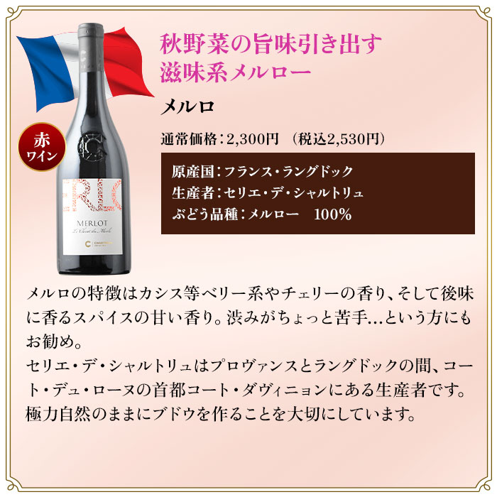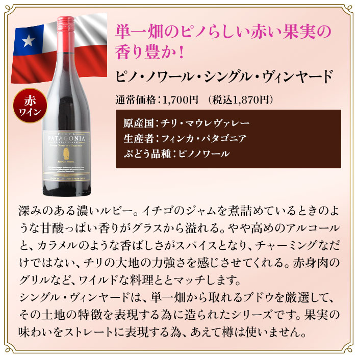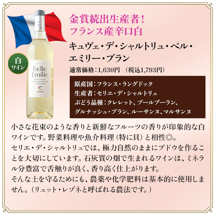 ●ボニトゥラ/カーサ・デ・フォンテ・ペケーナ ●マスカヴィネ・ブラン・ド・ブラン/ドメーヌ・ピエール・ショーヴァン ●メルロ/セリエ・デ・シャルトリュ ●ピノ・ノワール・シングル・ヴィンヤード/フィンカ・パタゴニア ●レッソ ティント/マサックス ●ラシーヌ・ヴァン・ド・ペイ・コンテ・トロサン・ブラン/ヴィニュロン・ド・ラバスタン ●シャトー・ル・ロック/ヴィニョーブル・ランディエ ●カサ・デル・セロ・レゼルヴァ・シャルドネ/ヴィニャ・マーティ ●キュヴェ・デ・シャルトリュ・ベル・エミリー・ブラン/セリエ・デ・シャルトリュ |