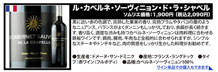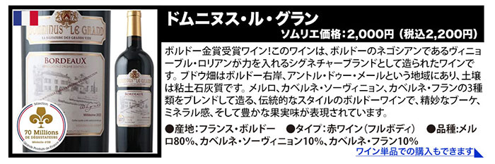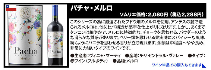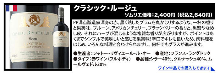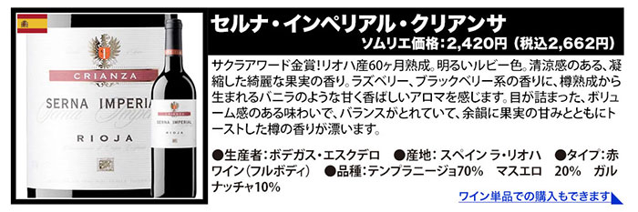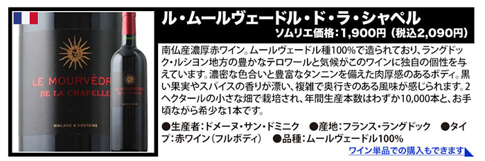 ●パチャ・レゼルヴァ・メルロ/ヴィニャ・マーティ ●キャンティ・リストレット・ディ・リリアーノ/マレンキーニ ●ドムニヌス・ル・グラン/ヴィニョーブル・ド・ロリアン ●ル・ムールヴェードル・ド・ラ・シャペル/サン・ドミニク ●セルナ・インペリアル・クリアンサ/ボデガス・エスクデロ ●クラシック・ルージュ/シャトー・リヴィエール・ル・オー ●ル・カベルネ・ソーヴィニョン・ド・ラ・シャペル/サン・ドミニク ●ラブ・レッド/ヴィニャ・マーティ |