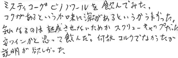 ミスティ・コーヴのピノ・ノワールをお気に召していただけたようで、大変嬉しく思います!当店ではかなり人気の生産者で、試飲会でこちらのワインを出した際にも皆様から大好評でした!