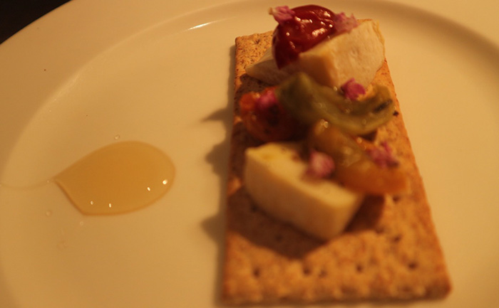 ▲さくらワイン交流会限定アミューズ「イタリア産カプリーノと自家製ドライトマトのカナッペ アカシアの蜂蜜添え」