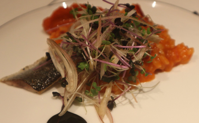 ▲さくらワイン交流会限定魚料理「秋の味覚 秋刀魚のグリエ 三浦産赤パプリカとチョリソのリゾットと共に。バルサミコのアクセント」