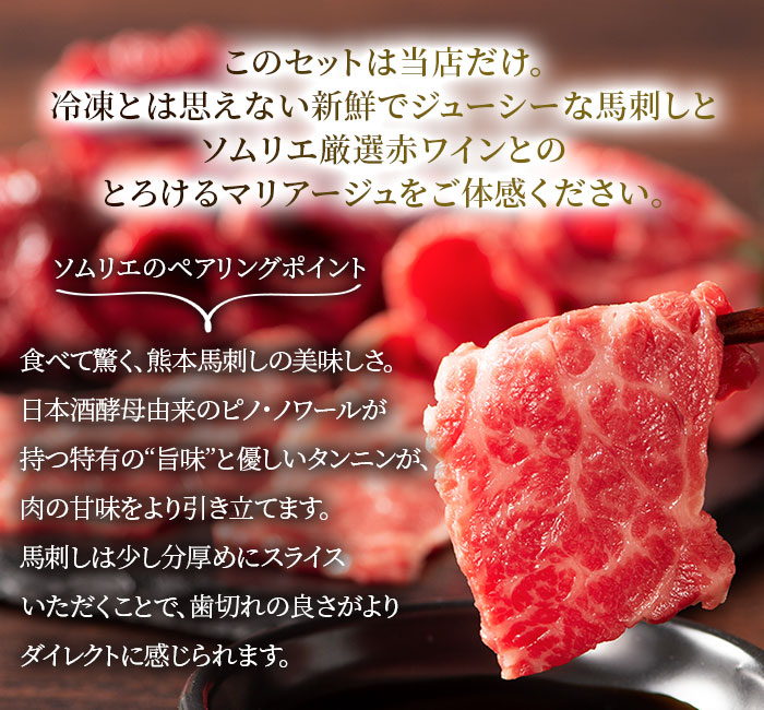| 内容量 | ワイン:750ml 食品:馬刺し中トロ、上赤身 各80g、ユッケ50g |