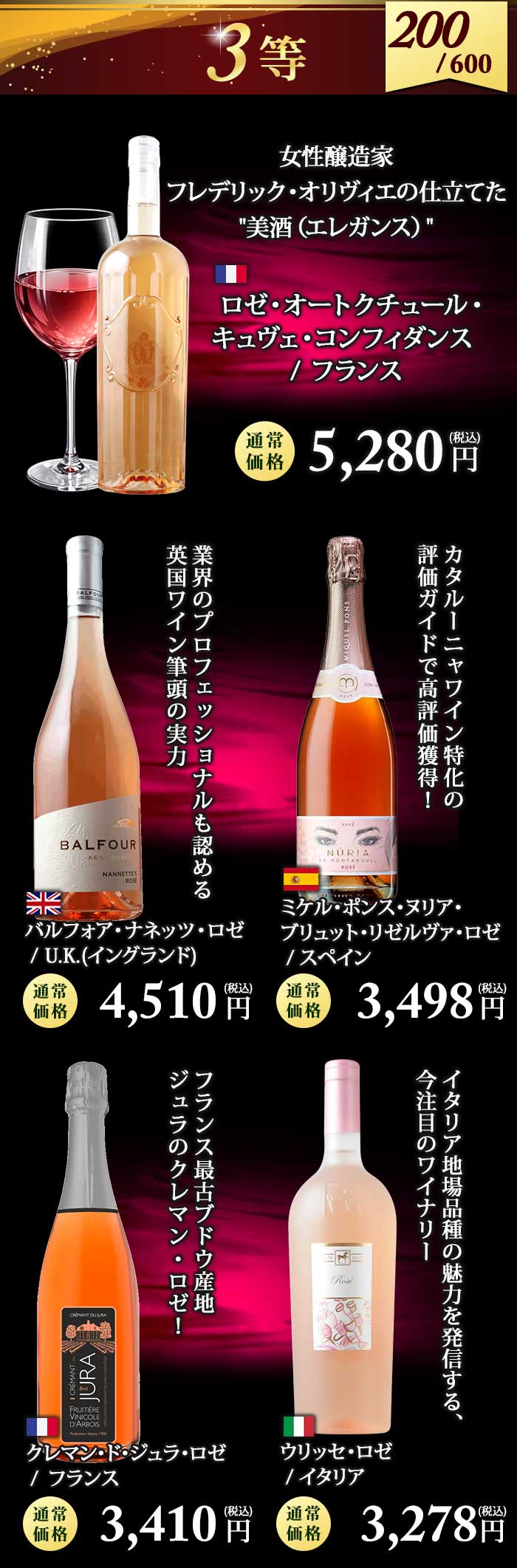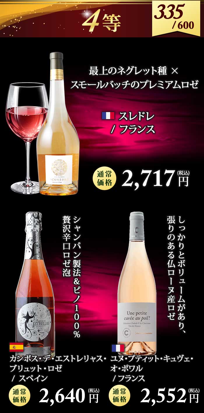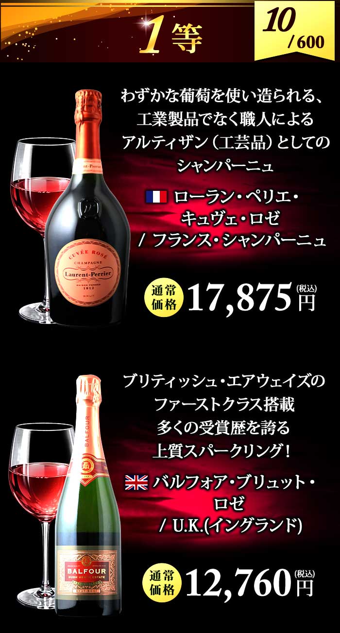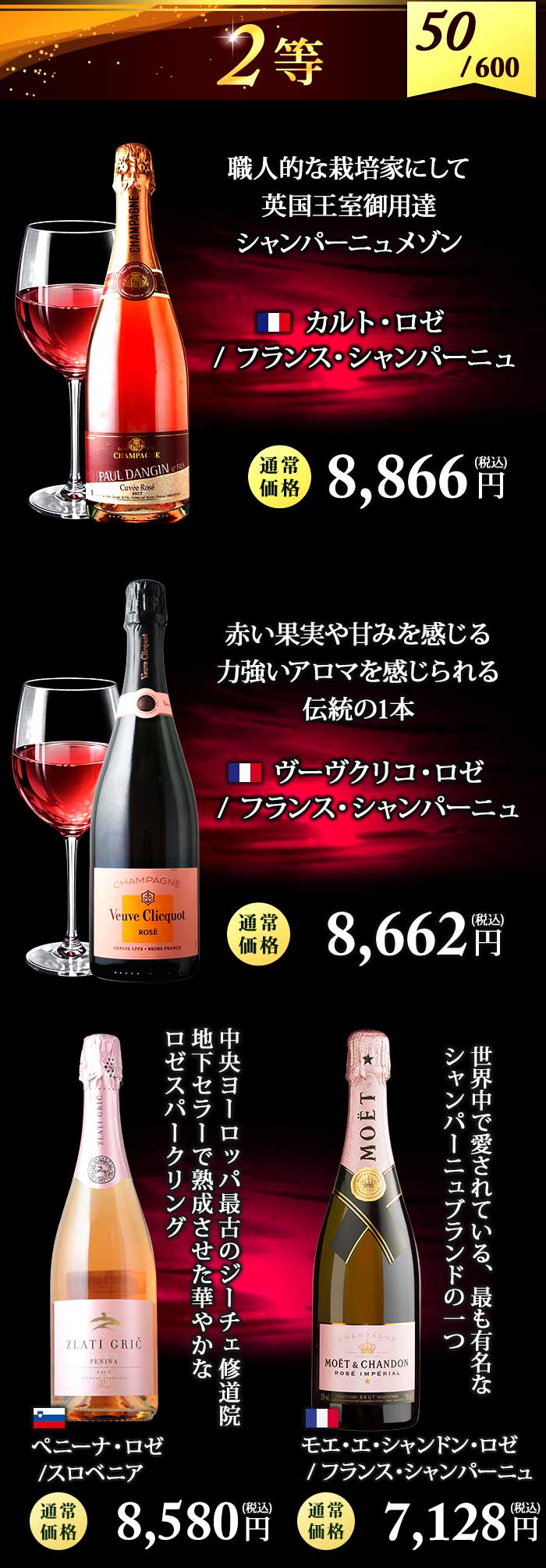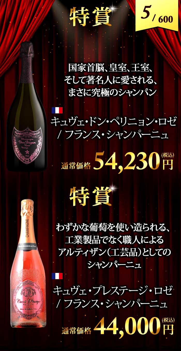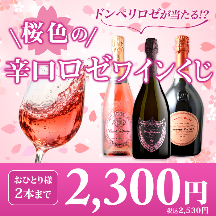54,230円~2,552円(税込)の高級ワインが 必ず入っているハズレなしのワインくじ! ↓ 以下のいずれか1本が入ってます♪ ↓ 【特賞】キュヴェ・ドン・ペリニョン・ロゼ / モエ・シャンドン(54,230円税込) 【特賞】キュヴェ・プレステージ・ロゼ / ポール・ダンジャン・エ・フィス(44,000円税込) 【1等】ローラン・ペリエ・キュヴェ・ロゼ / ローラン・ペリエ(17,875円税込) 【1等】バルフォア・ブリュット・ロゼ / ハッシュ・ヒース・エステート(12,760円税込) 【2等】カルト・ロゼ / ポール・ダンジャン・エ・フィス(8,866円税込) 【2等】ぺニーナ・ロゼ / ズラティ・グリツ(8,580円税込) 【2等】ヴーヴクリコ ロゼ / ヴーヴ・クリコ(8,662円税込) 【2等】モエ・エ・シャンドン・ロゼ / モエ・シャンドン(7,128円税込) 【3等】ロゼ・オートクチュール・キュヴェ・コンフィダンス / シャトー・ル・ブイ(5,280円税込) 【3等】バルフォア・ナネッツ・ロゼ / ハッシュ・ヒース・エステート(4,510円税込) 【3等】ミケル・ポンス ヌリア・ブリュット・リゼルヴァ・ロゼ / ミケル・ポンス(3,498円税込) 【3等】クレマン・ド・ジュラ・ロゼ / フリュイティエーレ・ヴィニコー(3,410円税込) 【3等】ウリッセ・ロゼ / テヌータ・ウリッセ(3,278円税込) 【4等】スレドレ / ヴィニョーブル・スレドレ(2,717円税込) 【4等】カンポス・デ・エストレリャス・ブリュット・ロゼ / ヴィネルジア(2,640円税込) 【4等】ユヌ・プティット・キュヴェ・オ・ポワル / セリエ・デ・シャルトリュ(2,552円税込) | |