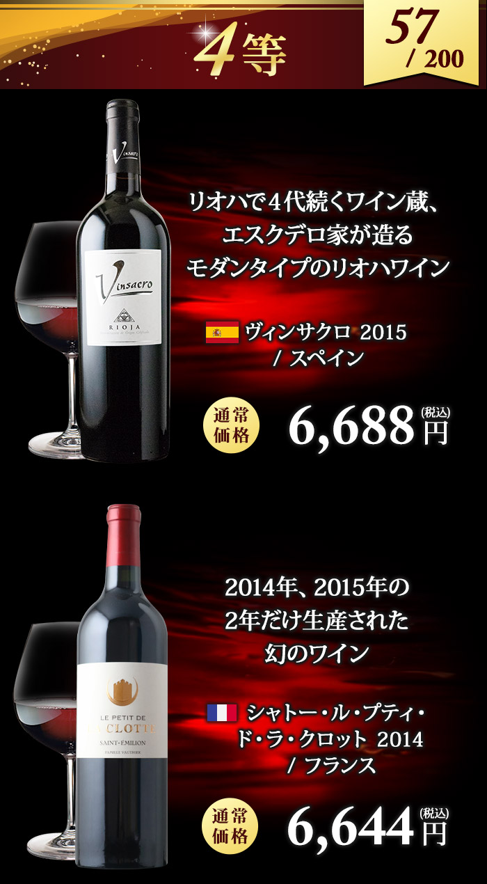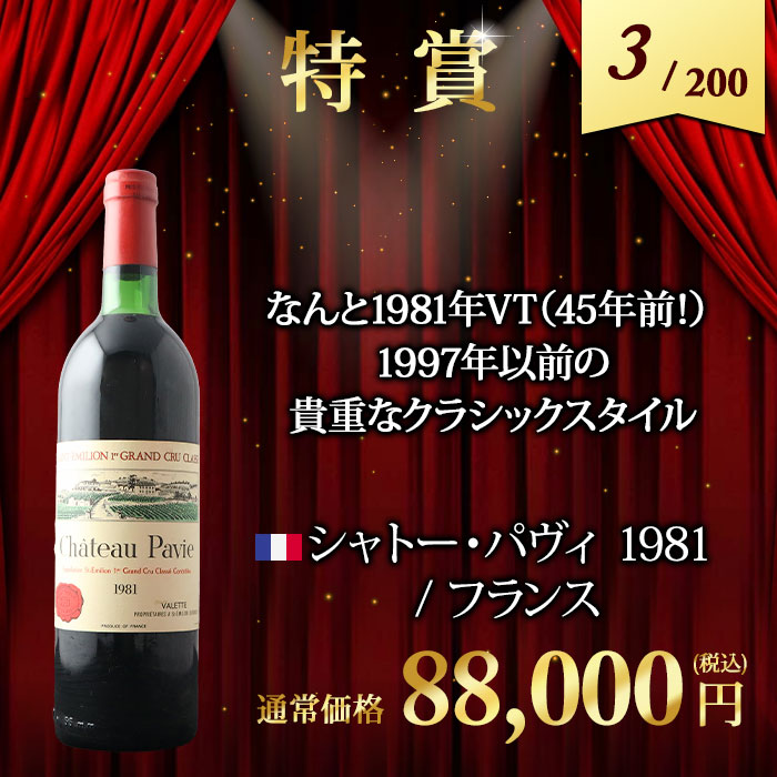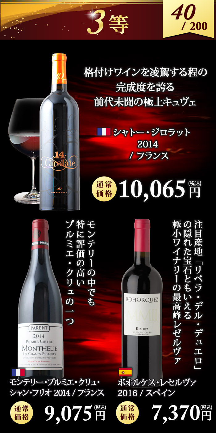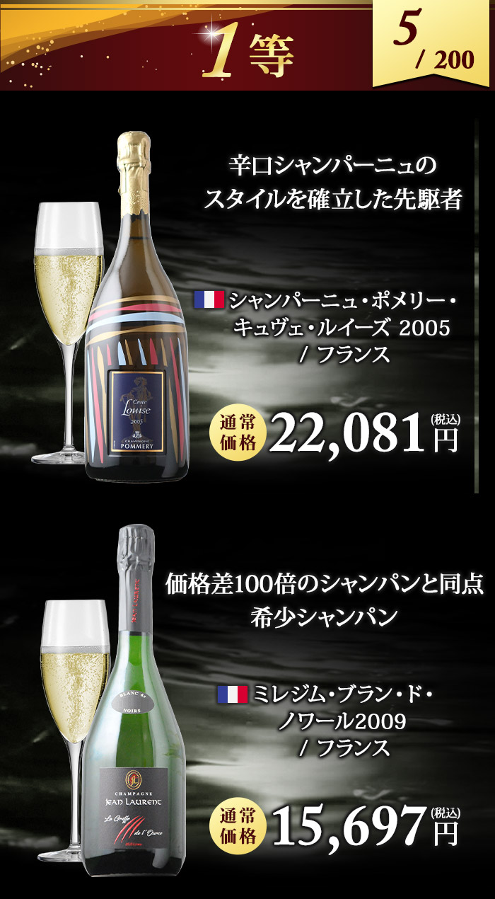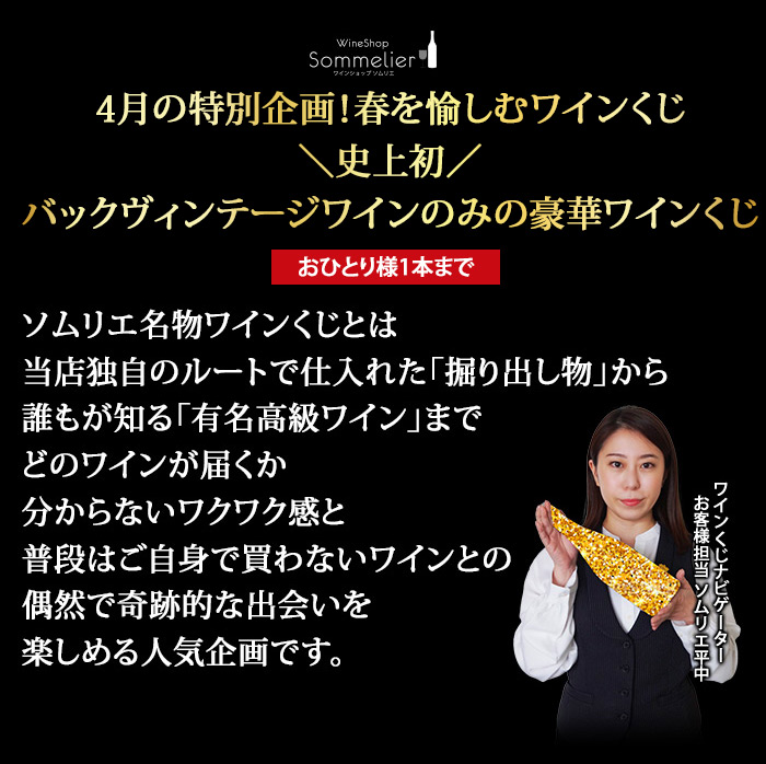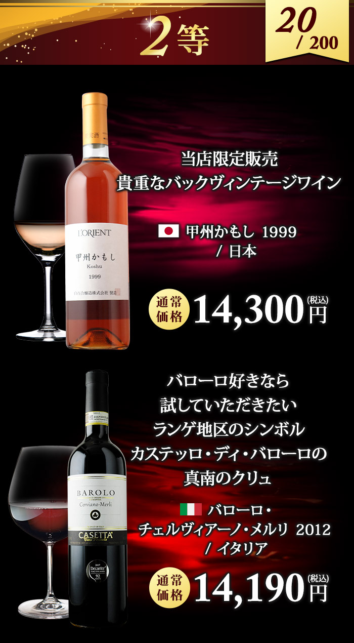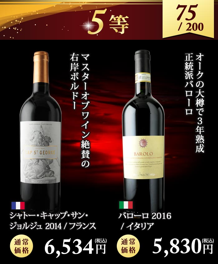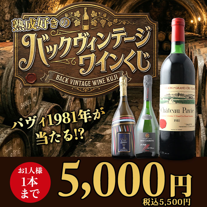 5,830円~88,000円(税込)の高級ワインが 必ず入っているハズレなしのワインくじ! ↓ 以下のいずれか1本が入ってます♪ ↓ 【特賞】シャトー・パヴィ 1981(88,000円税込) 【1等】シャンパーニュ・ポメリー・キュヴェ・ルイーズ 2005 / ポメリー(22,081円税込) 【1等】ミレジム・ブラン・ド・ノワール 2009 / ジャン・ローラン(15,697円税込) 【2等】甲州かもし 1999 / 白百合醸造株式会社(14,300円税込) 【2等】バローロ・チェルヴィアーノ・メルリ 2012 / カーサ・ヴィニコーラ・カゼッタ(14,190円税込) 【3等】シャトー・ジロラット 2014(10,065円税込) 【3等】モンテリー・プルミエ・クリュ・シャン・フリオ 2014 / ジャック・パラン (9,075円税込) 【3等】ボオルケス・レセルヴァ 2016 / ボデガス・ボオルケス(7,370円税込) 【4等】ヴィンサクロ 2015 / ボデガス・エスクデロ(6,688円税込) 【4等】シャトー・ル・プティ・ド・ラ・クロット 2014 / シャトー・ラ・クロット(6,644円税込) 【5等】シャトー・キャップ・サン・ジョルジュ 2014(6,534円税込) 【5等】バローロ 2016 / ヴェッキア・ストーリア(5,830円税込) | |