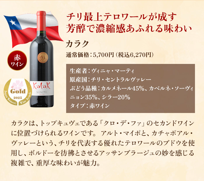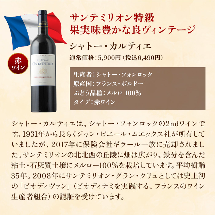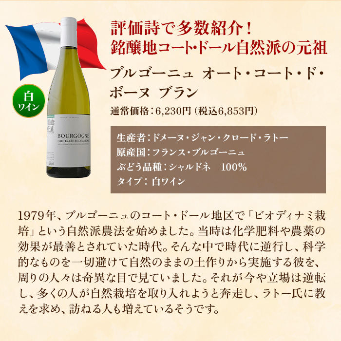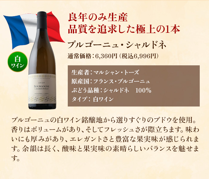 | ●シャトー・カルティエ/シャトー・カルティエ(赤ワイン) ●オート・コート・ド・ボーヌ・ブラン/ジャン・クロード・ラトー(白ワイン) ●ブルゴーニュ・シャルドネ/マルシャン・トーズ(白ワイン) ●カラク/ヴィニャ・マーティ(赤ワイン) |