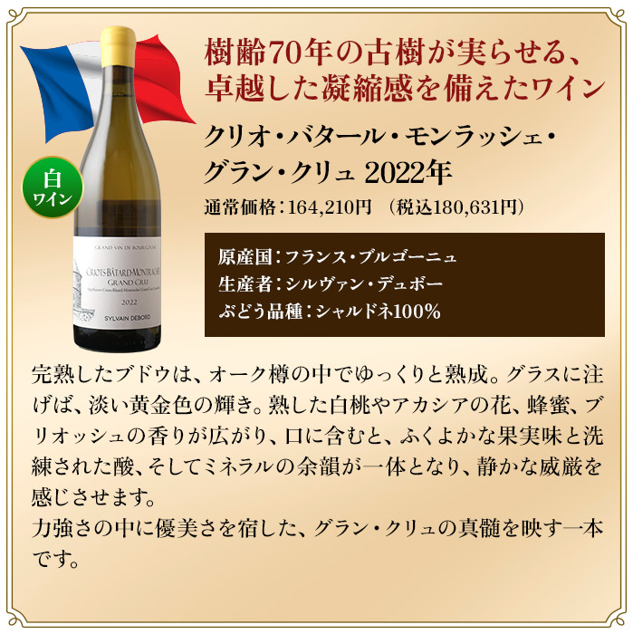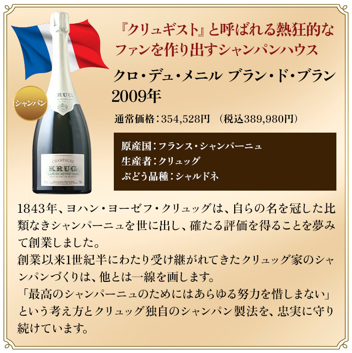 ●シャトー・シュヴァル・ブラン ●クリュッグ・クロ・デュ・メニル 2009年(箱あり) / クリュッグ ●クリオ・バタール・モンラッシェ 特級 2022 / シルヴァン・デュボー |