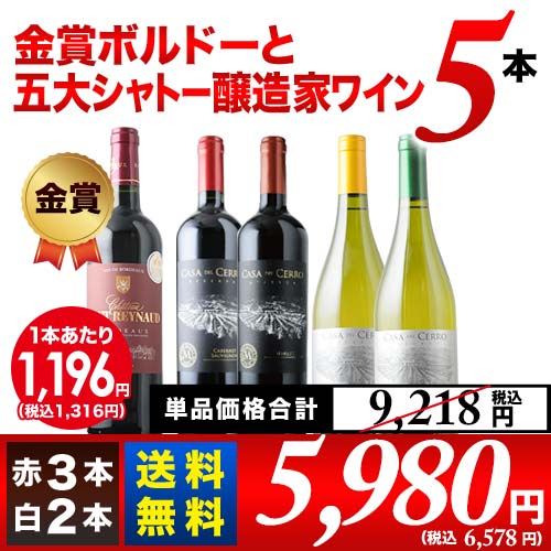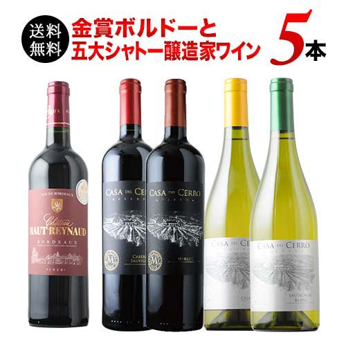 金賞ボルドーと五大シャトー醸造家ワイン5本セット(赤3本&白2本)