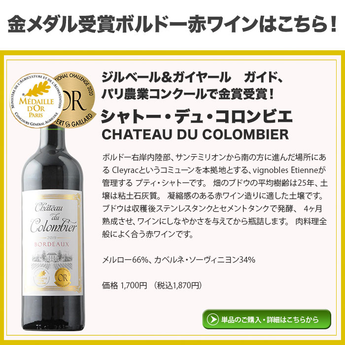 | 特徴 | 金メダル受賞ボルドー赤ワインと五大シャトー醸造家ワイン2種類の赤ワイン飲み比べのコスパ高ワインセット |