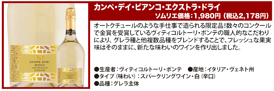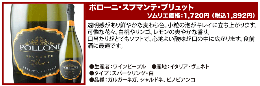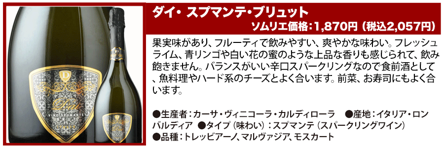 ●ジーグラー・クレマン・ダルザス / カーヴ・ド・ベブレンハイム ●チスパス・ブリュット / ロング・ワインズ ●シャルル・ぺルティエ ブラン・ド・ブラン ブリュット / ピフォー・ヴァン・エ・ドメーヌ ●ラ・エスカパーダ / ロング・ワインズ ●ディアマン・ロワイヤル・ブリュット / カーヴ・ド・ヴィサンブール ●ダイ・スプマンテ・ブリュット / カーサ・ヴィニコーラ・カルディローラ ●ボニトゥラ / カーサ・デ・フォンテ・ペケーナ |