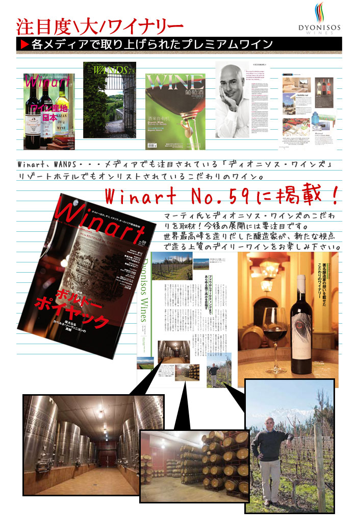 | 特徴: ムートン、アルマヴィーヴァなど世界のプレミアムワインを造ってきた醸造家、パスカル・マーティ氏が立ち上げたワイナリー。 | |