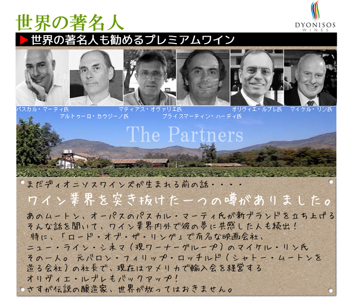 噂を耳にし、ワイン業界内外で彼の夢に共感した人が続出しました。例えば「ロード・オブ・ザ・リング」で有名な映画会社ニューライン・シネマ(現ワーナーグループ)のマイケル・リン氏や、元バロン・フィリップ・ロッチルド社の社長で、現在アメリカで輸入会社を経営するオリヴィエ・ルブレ氏もバックアップを申し出ました。