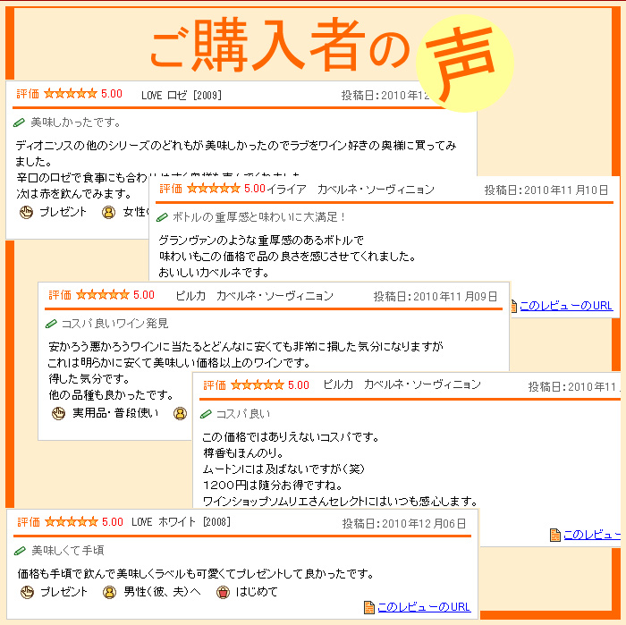 | ◆セット内容(白5本&赤7本の合計12本入り) ・カサ・デル・セロ・レゼルヴァ・シャルドネ(白) ・カサ・デル・セロ・レゼルヴァ・ソーヴィニョン・ブラン(白) ・カサ・デル・セロ・レゼルヴァ・カベルネ・ソーヴィニョン(赤) ・カサ・デル・セロ・レゼルヴァ・メルロ(赤) ・ラブ・ホワイト(白) ・ラブ・レッド(赤) ・パチャ・レゼルヴァ・メルロ(赤) ・パチャ・レゼルヴァ・カベルネ・ソーヴィニョン(赤) ・パチャ・レゼルヴァ・ソーヴィニョン・ブラン(白) ・マリポーザ・アレグレ・グラン・リゼルヴァ・シャルドネ(白) ・マリポーザ・アレグレ・グラン・リゼルヴァ・シラー(赤) ・コラゾン・デル・インディオ(赤) | |