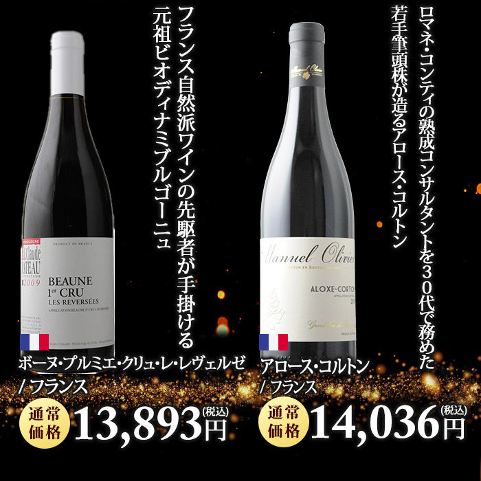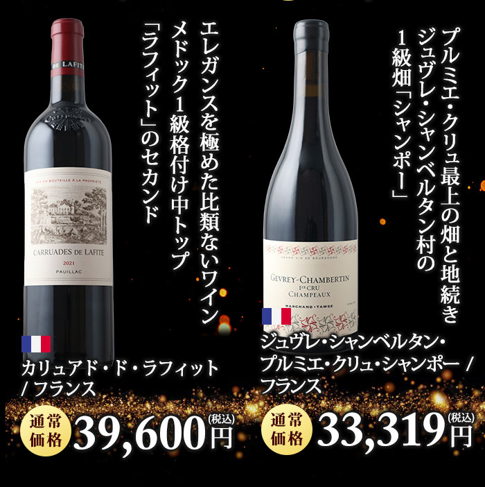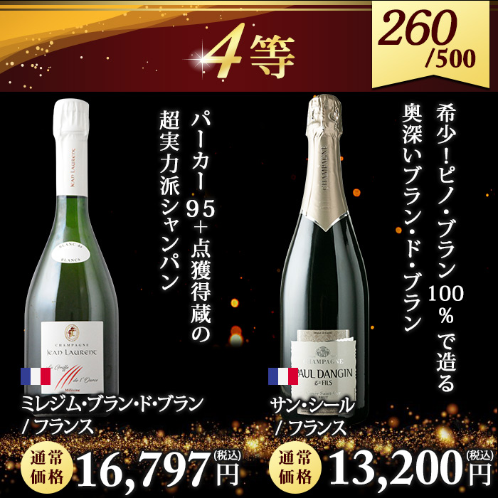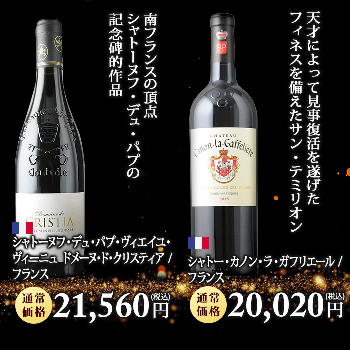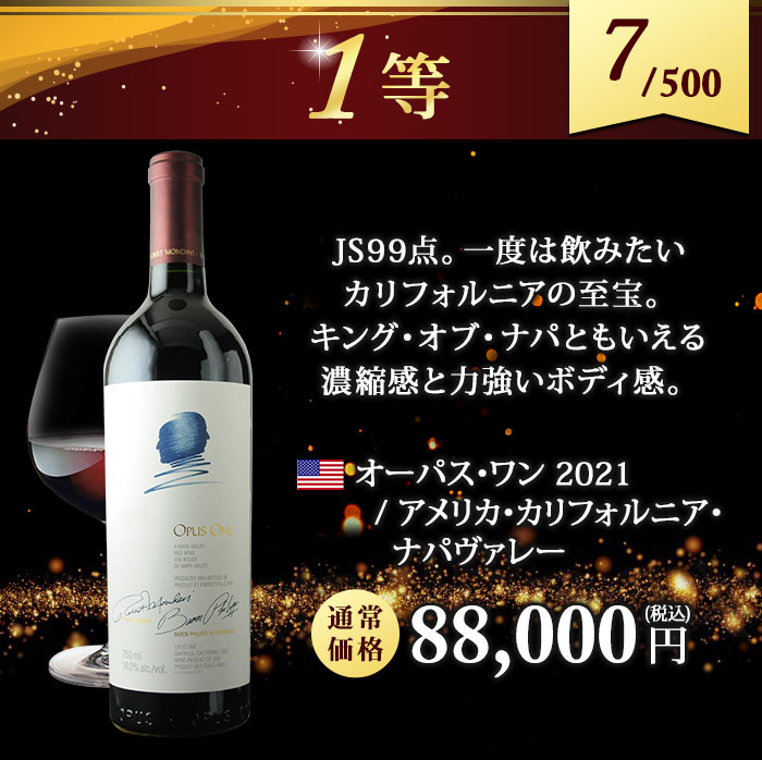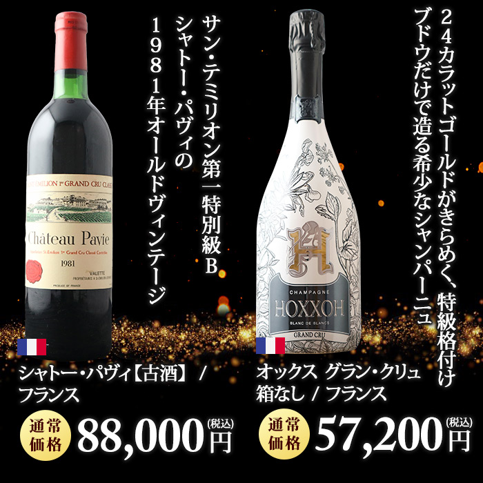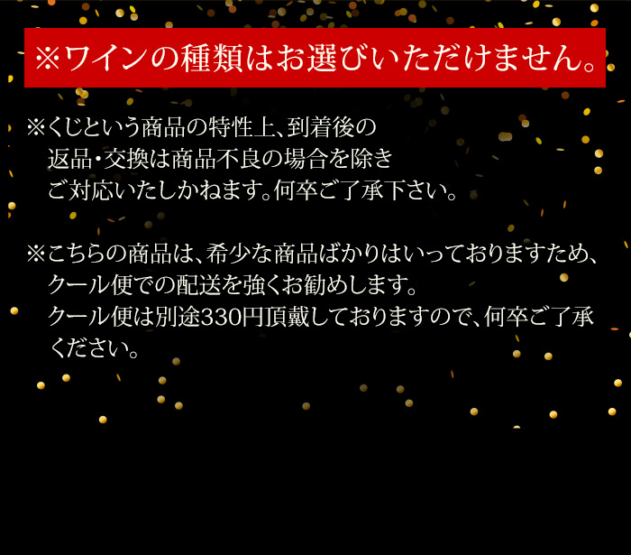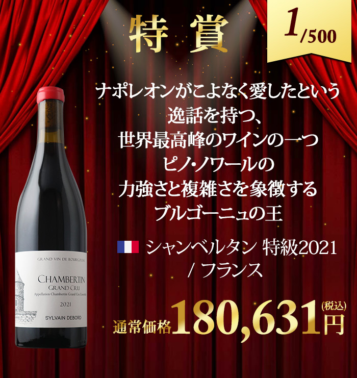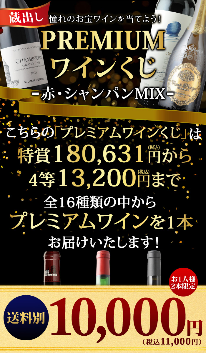 お一人様2本限定! 最低でも13,200円(税込)の高級赤orシャンパンが当たる! ↓ 以下のいずれか1本が入ってます♪ ↓ 【特賞】 シャンベルタン 特級 2021/シルヴァン・デュボー(税込180,631円) 【1等】 オーパス・ワン 2021(税込88,000円) シャトー・パヴィ【古酒】/シャトー・パヴィ(税込88,000円) オックス グラン・クリュ 箱なし/シャンパーニュ・オックス(税込57,200円) 【2等】 キュヴェ・プレステージ/ポール・ダンジャン・エ・フィス(税込44,000円) カリュアド・ド・ラフィット/シャトー・ラフィット・ロートシ(税込39,600円) ブリュット・ゴールド(ギフト袋入り)/アルマン・ド・ブリニャック(税込43,241円) ジュヴレ・シャンベルタン・プルミエ・クリュ・シャンポー/マルシャン・トーズ(税込33,319円) 【3等】 ペリエ・ジュエ・ベル・エポック・ブラン/ペリエ・ジュエ(税込27,843円) ヴォーヌ・ロマネ/マルシャン・トーズ(税込22,605円) シャトーヌフ・デュ・パプ・ヴィエイユ・ヴィーニュ(税込21,560円) シャトー・カノン・ラ・ガフリエール(税込20,020円) 【4等】 ミレジム・ブラン・ド・ブラン/ジャン・ローラン(税込16,797円) サン・シール/ポール・ダンジャン・エ・フィス(税込13,200円) ボーヌ・プルミエ・クリュ・レ・レヴェルゼ/ジャン・クロード・ラトー(税込13,893円) アロース・コルトン/ドメーヌ・マニュエル・オリヴィエ(税込14,036円) | |