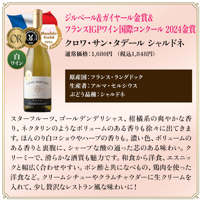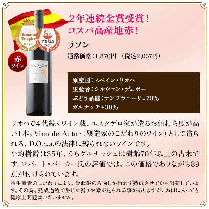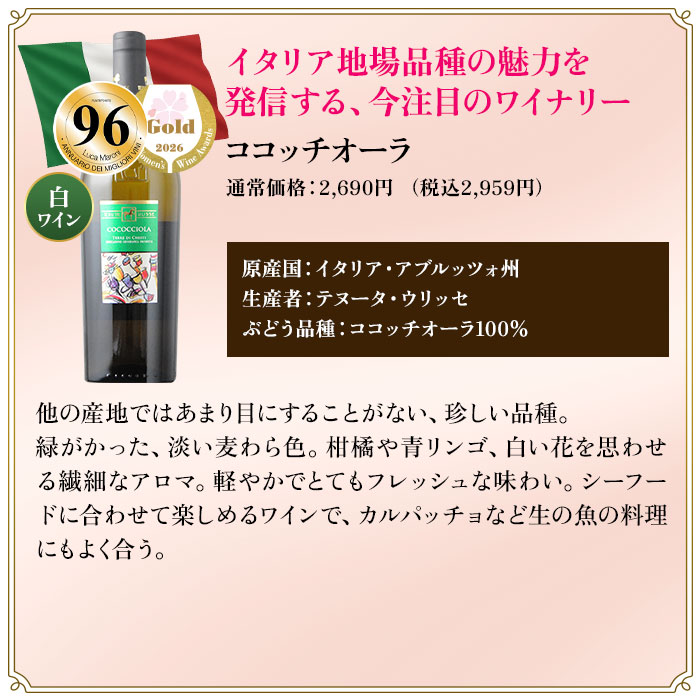 ●ラソン / ボデガス・エスクデロ ●クロワ・サン・タデール・シャルドネ / アルマ・セルシウス ●モンテプルチアーノ・ダブルッツォ / テヌータ・ウリッセ ●ココッチオーラ / テヌータ・ウリッセ ●ぎんの雫・グット・ダルジャン・ソーヴィニョン・ブラン / ヴィニャ・マーティ ●クロワ・サン・タデール・メルロ / アルマ・セルシウス ●エーデルツヴィッカー・コレクション / カーヴ・ド・リボヴィレ ●セルナ・インペリアル・ブランコ / ボデガス・エスクデロ ●リクオ・ロス・ロサード・ブリュット / ボデガス・エスクデロ ●セルナ・インペリアル・ホーベン / ボデガス・エスクデロ ●プラ・サヴィア・オレンジ / ボデガス・アルスピデ |