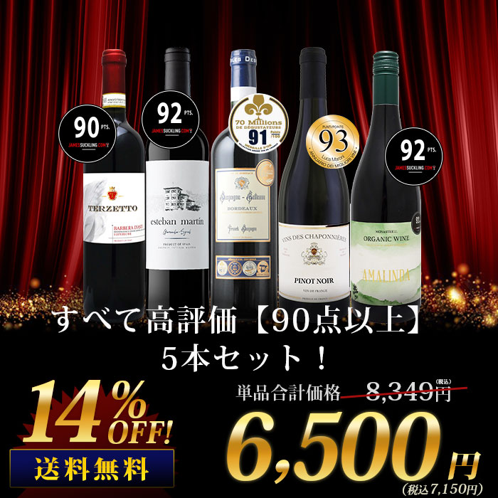 送料無料!金賞&高評価90点以上の赤ワイン5本セット