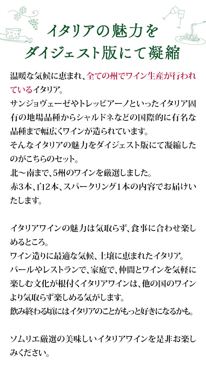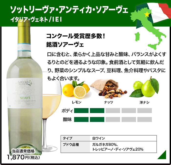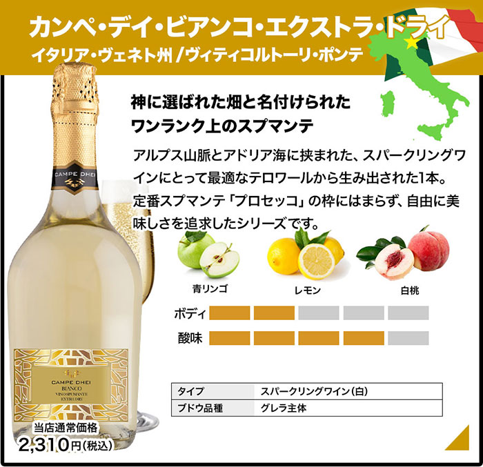 ●ネロ・オロ・ネロ・ダヴォラ/ワイン・ピープル ●キャンティ/ポッジョ・デ・ジェネーシ ●バルベーラ・ダスティ・DOCG/ウンベルト・フィオーレ ●ペモ・ペコリーノ/ワイン・ピープル ●ソットリーヴァ・アンティカ・ソアーヴェ/IEI ●カンペ・デイ・ビアンコ・エクストラ・ドライ/ヴィティコルトーリ・ポンテ |