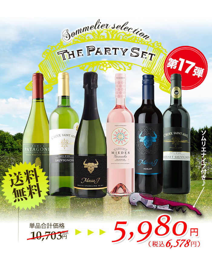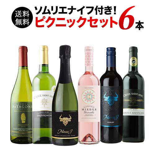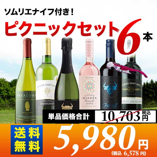 ソムリエナイフ付きで外でも安心 ピクニックセット6本入り第26弾 送料無料 (6人用) 泡2本&白2本&赤2本 ワインセット「9/12更新」