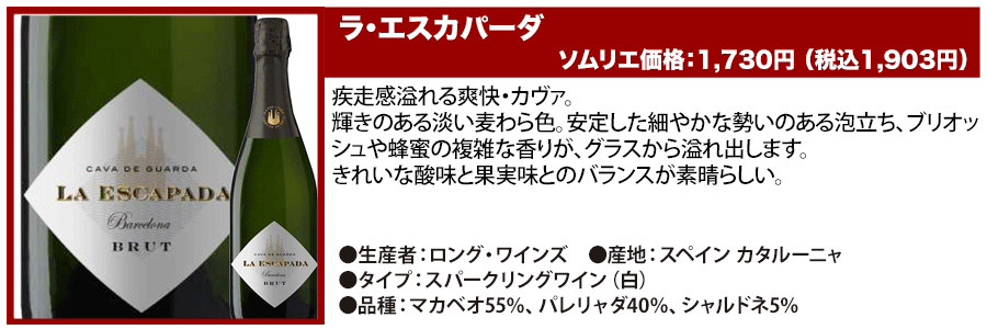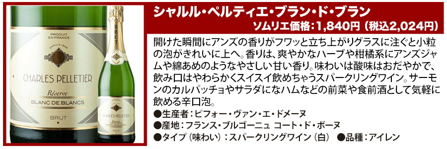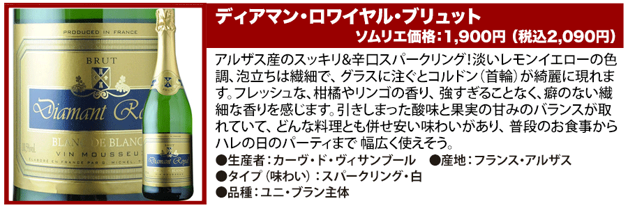 ●ジーグラー・クレマン・ダルザス / カーヴ・ド・ベブレンハイム ●チスパス・ブリュット / ロング・ワインズ ●シャルル・ぺルティエ ブラン・ド・ブラン ブリュット / ピフォー・ヴァン・エ・ドメーヌ ●ラ・エスカパーダ / ロング・ワインズ ●ディアマン・ロワイヤル・ブリュット / カーヴ・ド・ヴィサンブール ●ダイ・スプマンテ・ブリュット / カーサ・ヴィニコーラ・カルディローラ ●ボニトゥラ / カーサ・デ・フォンテ・ペケーナ |