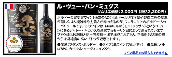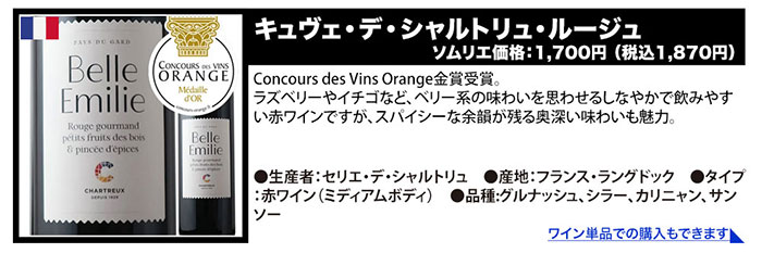 ●パチャ・レゼルヴァ・メルロ/ヴィニャ・マーティ ●キャンティ・リストレット・ディ・リリアーノ/マレンキーニ ●ドムニヌス・ル・グラン/ヴィニョーブル・ド・ロリアン ●ル・ムールヴェードル・ド・ラ・シャペル/サン・ドミニク ●セルナ・インペリアル・クリアンサ/ボデガス・エスクデロ ●クラシック・ルージュ/シャトー・リヴィエール・ル・オー ●ル・カベルネ・ソーヴィニョン・ド・ラ・シャペル/サン・ドミニク ●ラブ・レッド/ヴィニャ・マーティ |