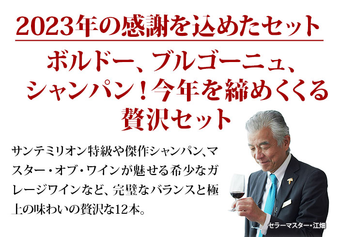 | セットの説明 | ボルドー特級、ブルゴーニュ、シャンパン!今年を締めくくる贅沢12本セット |