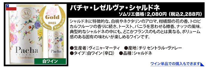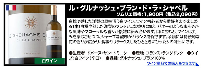●ル・ヴィオニエ・ド・ラ・シャペル/サン・ドミニク ●シャルドネ/セリエ・デ・シャルトリュ ●ミュスカ・セック・ビオ/カーヴ・ド・ラブレ ●フルール・グラン・シャン・デュ・シャトー・オー・リュフラジェ/シャトー・リュフラジェ ●パチャ・レゼルヴァ・ソーヴィニョン・ブラン/ヴィニャ・マーティ ●ミュスカデ・セーヴル・エ・メーヌ・シュール・リー/ドメーヌ・ド・ラ・ヴァンソニエ ●マリア・ド・カサル・アルバリーニョ/マニュエル・コスタ・エ・フィリ ●マリポーザ・アレグレ・グラン・リゼルヴァ・シャルドネ/ヴィニャ・マーティ |